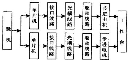系统的工作过程是:从键盘和鼠标输入定点坐标(X、Y)后,微机通过串口向各单片机发出指令,各单片机接受到指令后,由单片机软件控制X电机和Y电机的转动方向、转动步数、转动速度,达到自动定位的目的。系统所用电机为75BF001型反应式步进电机(其相数为三相,步距角1.5°/3°,直流电压为24V,相电流为3A)。