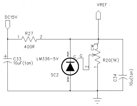 采用常用的51芯片作为控制器,P0口和DAC0832的数据口直接相连,DA的/CS和/WR1连接后接P2.0,/WR2和/XEFR接地,让DA工作在单缓冲方式下。 DA的11脚接参考电压,参考电压电路如图2所示,通过调节可调电阻调节LM336的输出电压为5.12V,所以在DAC的8脚输出电压的分辨率为 5.12V/256=0.02V,也就是说DA输入数据端每增加1,电压增加0.02V。