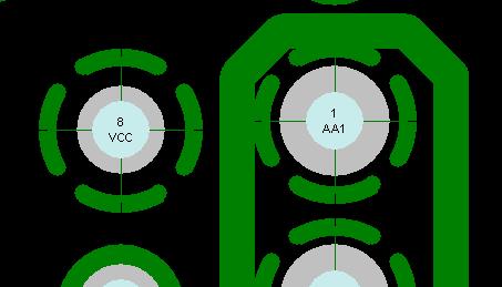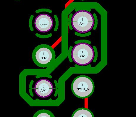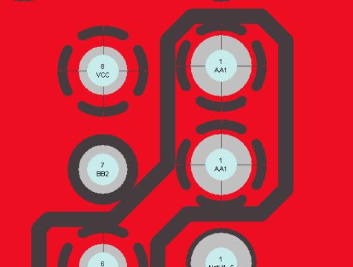 这时,网络为AA1的PAD中心也多了个十字架,说明,AA1网络已经从VCC层将这里焊盘连接起来了,注:千万注意,在内电层中不要再对这些焊盘进行走线了