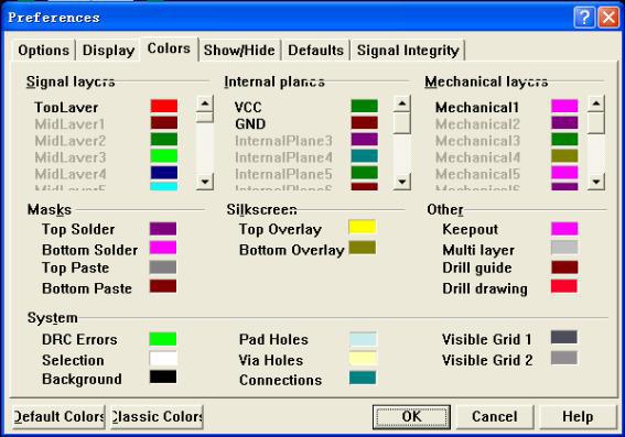 假如我们要查看的是VCC内电层,这里,我们将 的颜色设置为深一点的颜色,如棕黑色;再将背景色 设为平常的红色,单击OK关闭对话框。