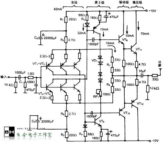 前级VT1~VT3和VT4~VT6为3个晶体管并联,发射极分别接入2.2Ω大的均流电阻,此电阻与输入的直流电阻成为热噪声源,为此,阻值要尽量小。
