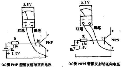 我们知道,锗管发射结的正向电压降一般在0.1~0.3V,而硅管发射结的正向压降为0.6~0.8V,根据这一特点便可通过如图1所示测试电路,判别出锗管和硅管。如图1(a)所示,对于PNP型管来说,电源Eb的正极按发射极,负极接基极,R是限流电阻,万用表置于直流电压档,如果测得的正向电压Ube在0.2V左右即为锗管,如果Ube在0.7V左右则为硅管。如图1(b)所示.测试NPN型管时,只需将电源Eb和表笔极性交换后测量即可。(注意图1中所用万用表为指针式,当用数字式时红黑表笔的接法应相反)