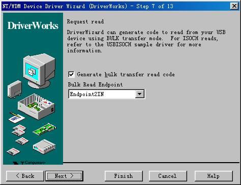 8. 在如图10所示的对话框中, 我们选择给端点2产生BULK Read的代码, 并且按"Next >"按钮. DW会给我们产生一套对端点2进行读的代码, 不用修改, 就可以直接使用.