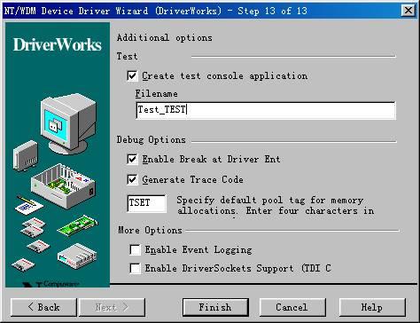 14. 在最后一个如图17所示的对话框中, 可以设置一些驱动程序的属性, 产生一个console测试程序. 按下"Finish"按钮, 就结束了Wizard.