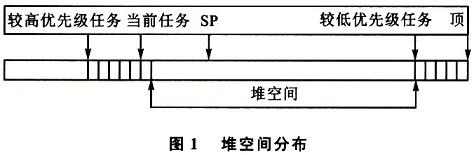 基于以上的分析与目的,近日完成了这个操作系统。在堆栈上借用RTx的管理方法,即当前任务使用全部的堆空间,如图1所示。