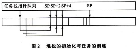 为什么要以这样一种规律而不是其他的方式呢?这是由于在任务建立后,还未进行任务调度之前,各任务的堆栈实际上是它们自身的地址,因而其堆栈深度为2,为了程序的简便而直接填入。