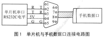 需要注意的是:不同手机数据线内部电平转换芯片的供电方式是不同的,有的是通过手机直接供电;有的是通过窃取PC机串口某些引脚(通常为4、6、7、8引脚)的电流经内部整流滤波稳压后提供。判断的方法是将数据线一端插到手机数据口,测量另一端2脚与5脚之间的电压,如果有一7V左右的电压,则为前者,如果测不出电压,则为后者,对于后者则需要单片机为4、6、7、8引脚任意一引脚提供+5V电压即可,如图1中虚线所示。